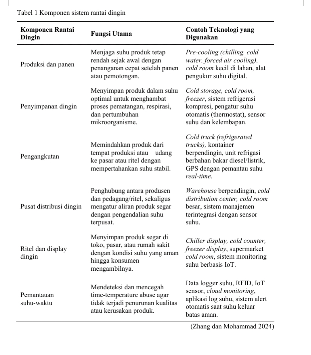Pengendalian suhu dan waktu dalam rantai dingin berperan dalam memperlambat proses pematangan, respirasi, dan pertumbuhan mikroorganisme. Sehingga, kualitas, keamanan, dan umur simpan produk dapat dipertahankan dalam jangka panjang. Adapun komponen-komponen pada sistem rantai dingin, beserta fungsi dan teknologi yang digunakan disajikan pada Tabel 1.